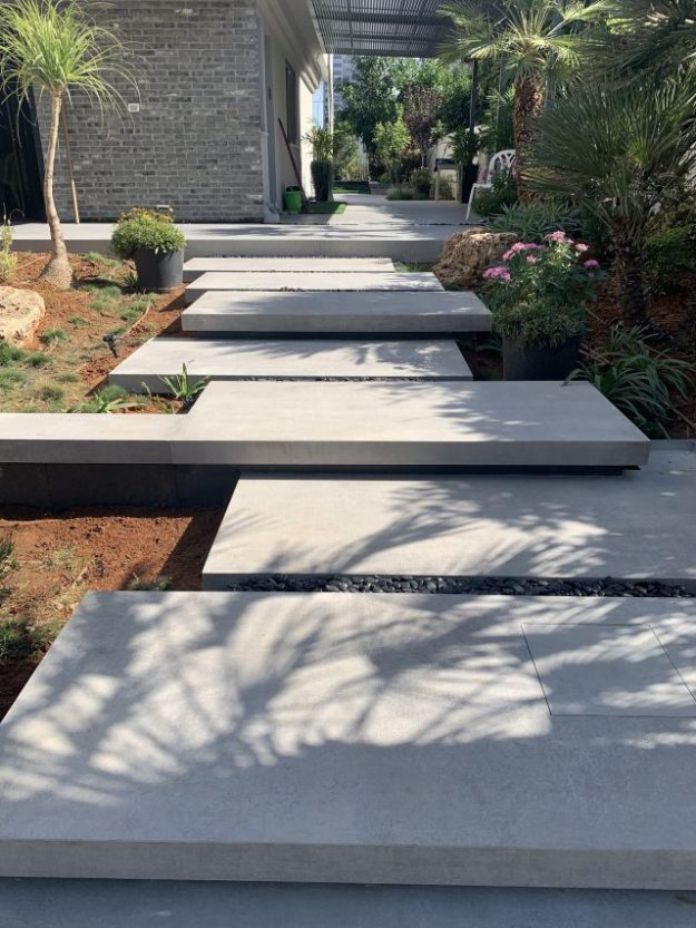 ריצוף מדרגות באריחי בטון אדריכלי, כל מדרגה מגיעה כחידה שלמה בהתאמה למידות בשטח.