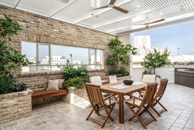 השילוב המנצח שלנו ? לבנים עתיקות מפירוקים בגוון אפור על גבי ריצוף בלו-סטון.