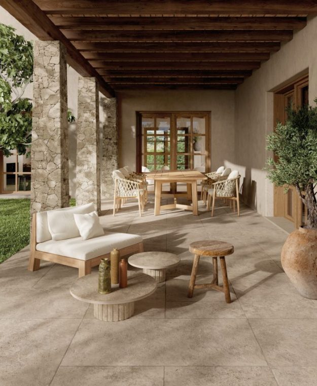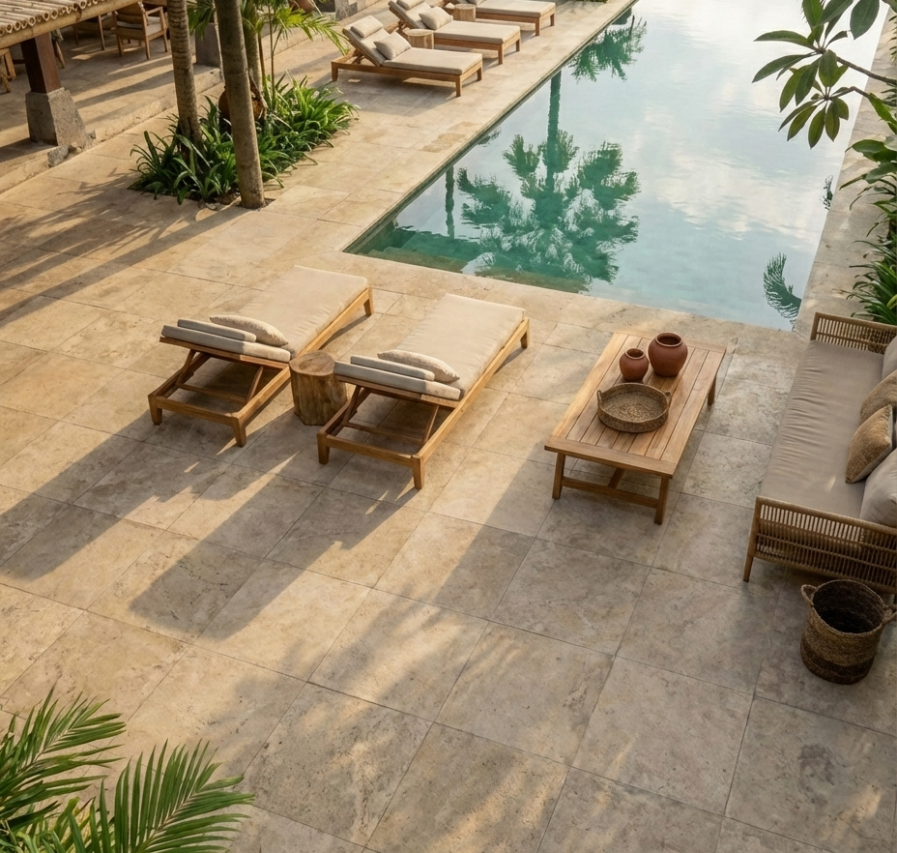 ריצוף בהשראת טרוונטין בעובי 1 ס”מ ו-2 ס”מ, מושלם לחיפוי אזור הבריכה, חוץ ופנים.