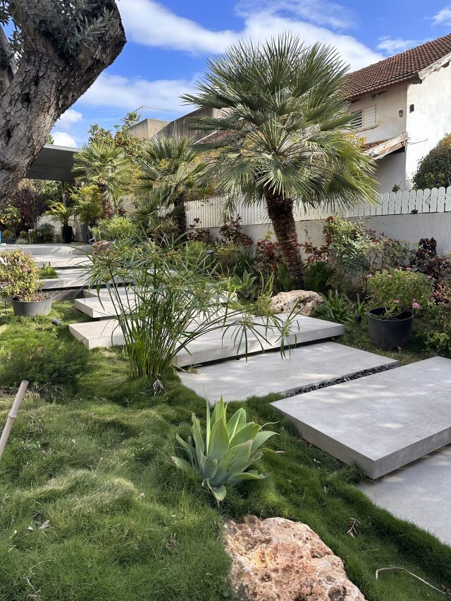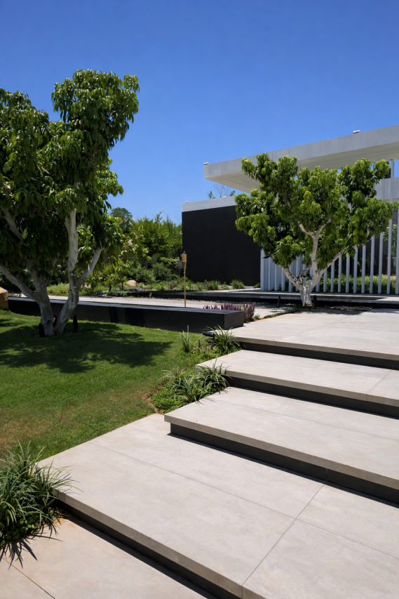 ריצוף מדרגות באריחי בטון אדריכלי, כל מדרגה מגיעה כחידה שלמה בהתאמה למידות בשטח.